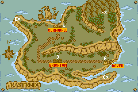 A ドーバー Dover Talk to Druid Priest モースフィール Mosfiel B ブライトン Brighton Item: ギョウザ Gyoza C ドルイド祭壇 Druid Altar Magic: フェフ Fehu D コーンウォール Cornwall - ピカデリーサーカス Picadelly Circus Sub-boss: サーカス団長 Circus Leader Item: 銀の首飾り Silver Necklace Take to weapons shop to make Item: 銀の弾丸 Silver Bullet Search grave for Item: 銀の拳銃 Silver Pistol E ドルイド祭壇 Druid Altar Magic: オシラ Othila F ダートムアの洞窟 Dartmoor Cave Sub-boss: 満月のウンギエ Full Moon Ungie Boss: 満月のウンギエ Full Moon Ungie Use Silver Pistol to "finish" Item: 犬狼の牙 Wolf Fang Take to Julia in Cornwall |