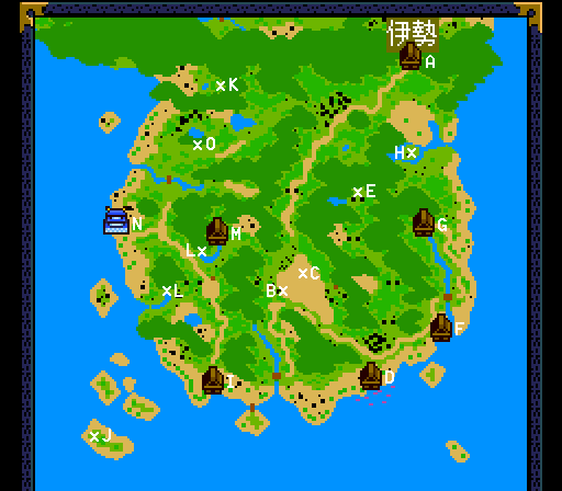 A 尾鷲村 Owase Village Orphan: 明菜 Akina B 嘆き谷 Moan Valley C イヒカの村 Ihika Village Use Moan Ring on purple statue Scroll: 天人 Tenjin Item: 四水の鏡 Four Waters Mirror D 串本村 Kushimoto Village Use mirror on statue in building in north of village Item: 壱の銅鐸 Bronze Bell One E 天狗の庵 Tengu Retreat Scroll: 引波 Hikinami F 新宮村 Shinguu Village Blow up rock with boat G 熊野村 Kumano Village Use mirror on statue Flip switches in order shown by row of statues in front Get boat H 天狗の庵 Tengu Retreat Scroll: 母忘 Hahawasure I 白浜村 Shirahama Village Blow up rock with boat Use mirror on statue Item: 弐の銅鐸 Bronze Bell Two J 天狗の庵 Tengu Retreat Scroll: 泥虫 Doromushi K 天狗の庵 Tengu Retreat Scroll: 冬枯 Fuyugare L 竜神洞 Ryuujin Cave M 清姫村 Kiyohime Village Use mirror on statue Sub-boss: くちなわ姫 Princess Kuchinawa- HP 260 Item: 参の銅鐸 Bronze Bell Three N 和歌山町 Wakayama Town - 和歌山城 Wakayama Castle Item: 山門のカギ Mountain Gate Key O 高野山 Kouya Mountain Use Mountain Gate Key on door Sub-boss: 突撃!角太郎 Totsugeki! Tsunotarou- HP 280 Use mirror on statue Item: 四の銅鐸 Bronze Bell Four |