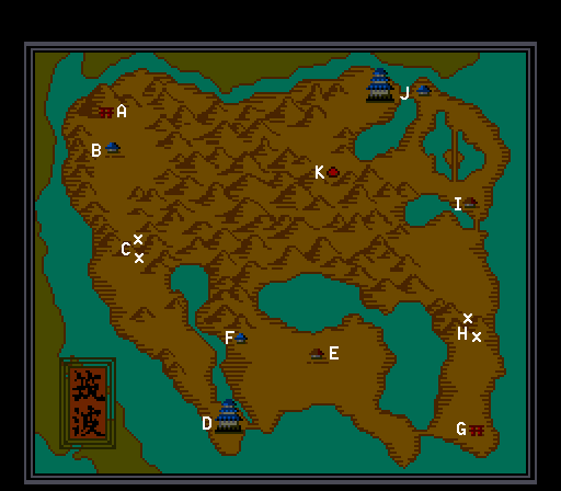 A 筑波山 Mt. Tsukuba Talk to toads for money B 筑波村 Tsukuba Village Meet 金太 Kinta C ナマズの洞 Catfish Cave Sub-boss: タヌキの金太 Kinta the Tanuki Item: たぬきカギ Tanuki Key Use Tanuki Key on locked chest Item: 大ひげぬき Giant Tweezers Use on giant catfish D つちうら町 Tsuchiura Town - つちうら城 Tsuchiura Castle E 雲切の里1 Kumogiri Village 1 The little toad コガマ joins F ボクデンの家 Bokuden's House G かしま神社 Kashima Shrine Rescue 白シカ White Stag Scroll: 若草 Wakakusa H タヌキの洞 Tanuki Cave Sub-boss: 大ダヌキ Giant Tanuki I 雲切の里2 Kumogiri Village 2 Learn Steal ぬすむ command J 水戸町 Mito Town - 大門教会 Daimon Church Sub-boss: 大ダヌキ Giant Tanuki - 水戸城 Mito Castle Item: 鉄のカギ Iron Key - 胎内洞 Womb Cave Boss: ゴーモン Goumon K Rescue 白ダヌキ White Tanuki Scroll: 粉火 Konabi |